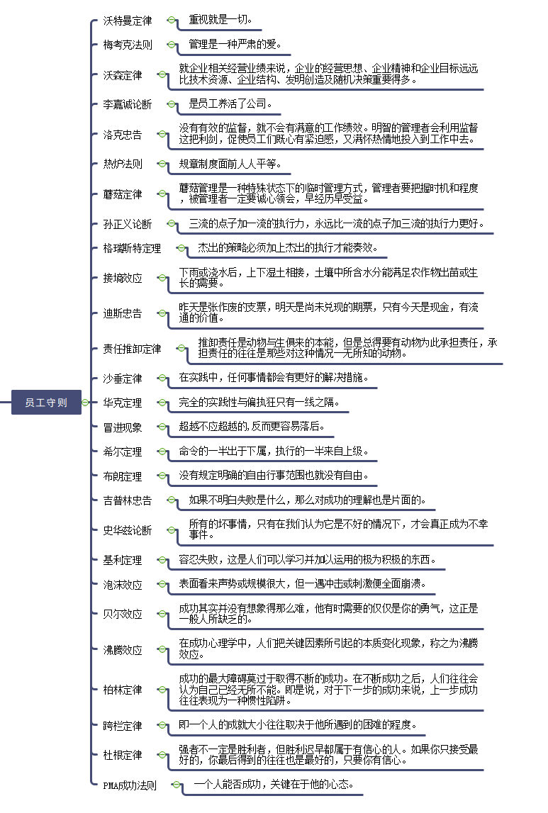 本文小编用思维导图整理了世界500强企业的经典管理法则,法则主要从八个方面整理,员工守则、团队建设、激励法则、识人用人、领导艺术、管理实务、管理制度、领导力。不管是否位居管理层的你,看完这些内容后或许会在某些思维怪圈茅塞顿开。
