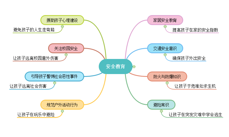 安全教育包含的内容非常多,总的来说涵盖这几个方面:居家安全教育、交通安全意识、防火与防爆知识、避险常识、规范户外活动行为、引导孩子警惕社会恶性事件、关注校园安全、关注校园安全、援助孩子心理建设。思维导图不仅是日常学习工作的好帮手,作为家长的你,不妨通过本文的安全教育思维导图,好好学习一下如何加强对孩子的安全知识教育。除了教育孩子保护好自己,记得也要教他善良之心,不要一不小心成为了伤害人的那一方。