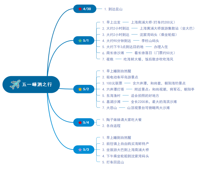 五一放假四天对于还没有来得及做足出行准备的朋友,可以通过思维导图做一下详细计划安排,包括时间和所带物品。都可以通过思维导图做分类,这样就不怕耽误车程或者跟朋友见面时间错开等意外因素。当然,如果你觉得毫无头绪,也可以去,里面有很多旅行计划模板,我们只需要根据自己的计划进行补充就好了,方便又节省时间。