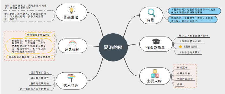 《夏洛的网》讲述的是生活在谷仓里的小蜘蛛夏洛为了拯救好朋友小猪威尔伯的生命,织出了被人类视为奇迹的网上文字,威尔伯的生命由此被彻底改变,但是夏洛却走到了生命的尽头。简单朴实的故事更能打动心房,通过亲子之间互动阅读,分享令彼此感动、触动心灵的地方。通过MindMaster思维导图可以将小说做更深入的剖析,从小说的创作背景到经典的语录,从宏观上让孩子更好的弄懂这本书的思想。