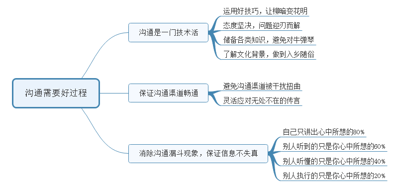 整个沟通过程分为发放者编码、沟通渠道、收讯者解码。如果将编码,渠道与解码三个关键步骤做好,沟通才会顺利。对于发放者而言,沟通是门技术活,需要技巧、态度、知识和文化背景。还要保证沟通渠道畅通。也许你觉得你的想法很完美,但当交给别人去执行时,结果却是大相庭径。究其原因,就是存在沟通漏洞,导致信息失真。因此应当消除沟通漏洞,保证信息的不失真。