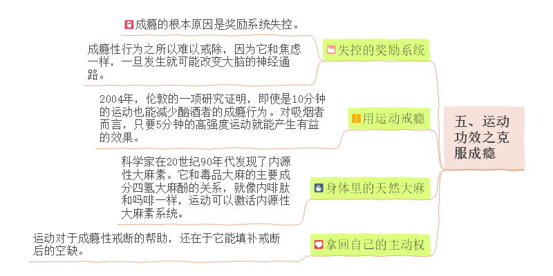 一项研究证明,酗酒者仅仅高强度运动十分钟,成瘾行为减少许多;而对吸烟者来说,要达到同样的戒瘾效果,只需要5分钟。而对于毒瘾者,就需要漫长的运动治疗了。所以,如果身边有成瘾者,请劝他多运动吧。最好是如作者的建议那样,起码要进行每周5天、每天30分钟高强度的有氧运动。