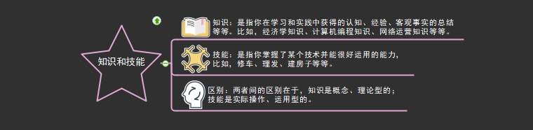 冰山上面的一部分是可以看见的,那么什么是知识?什么是技能?在你的印象中,你觉得是怎么样的,小编的理解是知识是你从学习、工作、生活中实践到的经验,理论性的东西,技能是你熟练掌握了这个项目之后,快速上手、运用,可操作性较强。