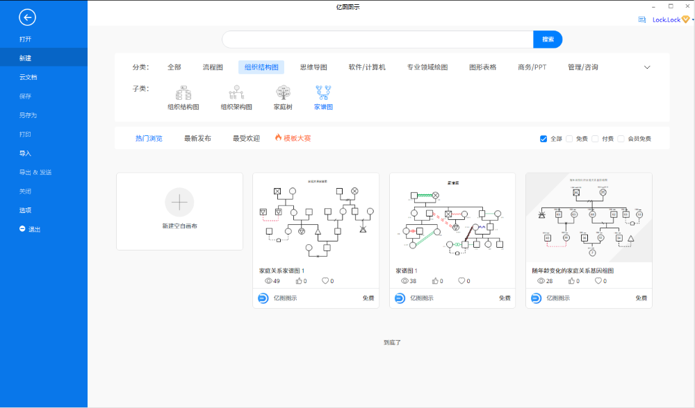 第二步:点击分类“组织结构图”,子类选择“家谱图”,寻找符合设计要求的家谱图模板,点击“使用”打开家谱图模板。