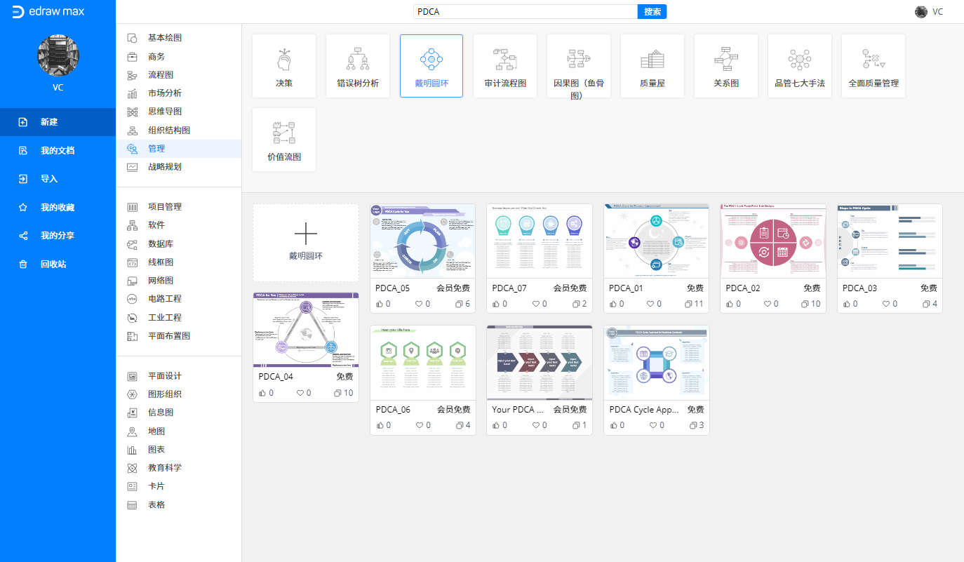 第二步:新建PDCA管理循环图。依次点击“管理”→“戴明圆环”。然后从例子库中,选择一个模板,点击打开PDCA管理循环图模板。