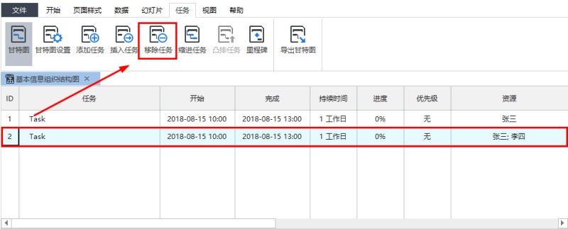 2.移除。在甘特图区域选中要移除的任务,点击【移除任务】来将某项任务移除。
