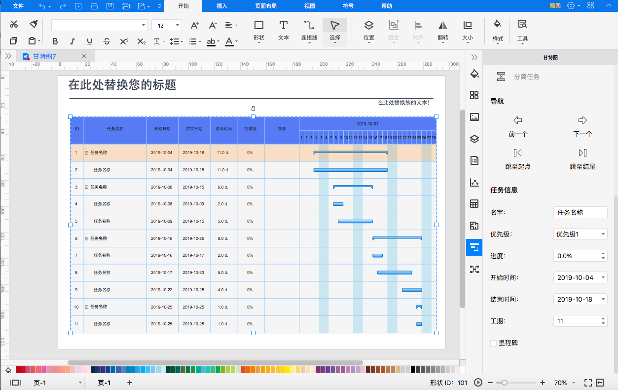 第四步:单击选中画布模板图标中的任意一行,双击所需要更改的文本,在右侧工具栏中就会出现“任务信息”,可在此重新编辑任务名称,时间等相关信息。此外还可以点击上方的文本,新添一个文字模板。