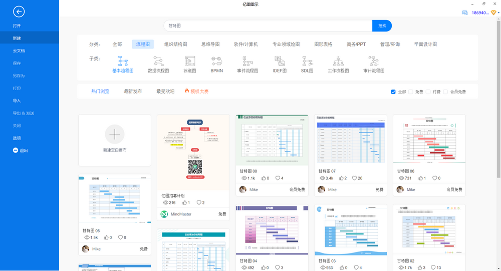 第二步:新建“甘特图”。依次点击“新建”-搜索框内填写“甘特图”。然后从样板库中,选择一个模板,点击打开选中的甘特图模板。