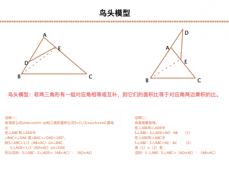 鸟头模型是五大几何模型之一,应用于平面几何问题中。如果两个三角形中有一个角相等或互补,那么这两个三角形叫做共角三角形。鸟头模型的定义就是共角三角形的面积比等于对应角两夹边的乘积之比。 ...