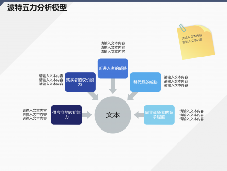波特五力模型是什么呢?波特五力模型是一种分析模型,波特五力模型是将大量不同因素汇集在一个简单的模型中,以此分析一个行业的基本竞争态势,波特五力模型中的五种力量分别为同行业内现有竞争者的竞争能力、潜在竞争者进入的能力、替代品的替代能力、供应商的讨价还价能力、购买者的议价能力。让我们用亿图图示绘制吧 ...