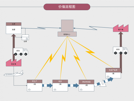 价值流程图是用来描述物流和信息流的一种分析工具,即了解产品生产周期的有效工具,它是用来帮助企业理解和精简生产流程。价值流程图记录了生产过程的周期时间、在制品库存、原材料流动等信息,形象化当前的生产活动状态,并且有利于管理人员对生产流程进行指导,将生产过程达到最优。 ...