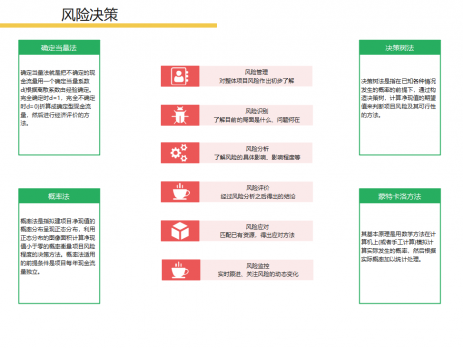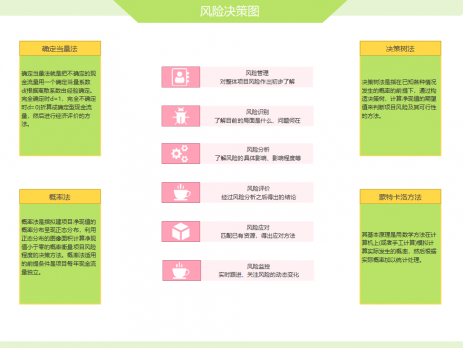利益往往伴随着风险,风险是企业在发展过程中一定会遇到的。风险决策是针对市场分析出的不确定因素所制定的决策图。一份风险图往往要包含多种决策方法,以应对不同的风险,同时还要根据所分析的风险,计算企业所能承担的风险度。风险决策分析主要的特点是不确定性,分为概率性决策和不定型决策。 ...