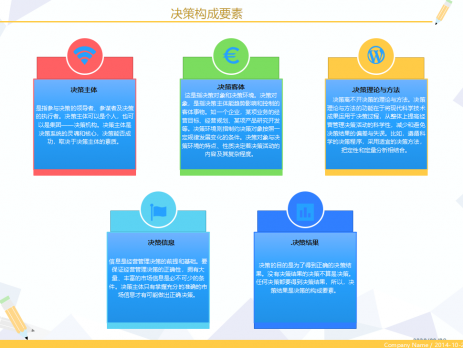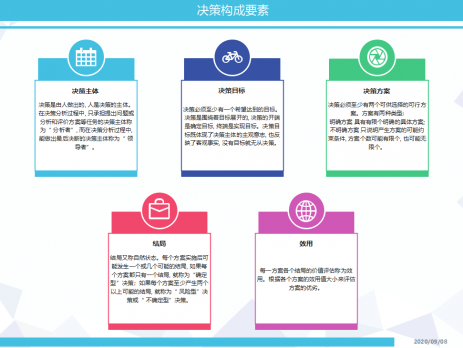 决策构成要素就是构成一个决策的主要部分,一般分为决策主体、决策客体、决策理论与方法、决策信息、决策结果五个部分。分别指参与决策的领导者、参谋者及决策的执行者、决策对象和决策环境、决策的理论与方法、丰富的市场信息、为了得到正确的决策结果。正是这五部分才构成了一份合格的决策方案图。 ...