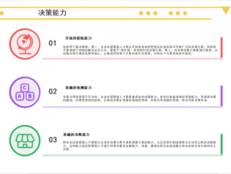 决策能力是指领导者或经营管理者对某件事拿主意、作决断、定方向的领导管理效绩的综合性能力。包括:经营决策能力、经营管理能力、业务决策能力、人事决策能力、战术与战略决策能力等。 ...