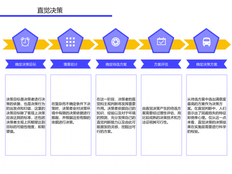 管理者完善改进决策通常运用直觉来帮助制定,这就叫直觉决策。直觉决策的决策过程是要根据决策者的经验、能力、以及敏锐的判断进行潜意识的决策,研究者通过对管理者直觉的运用,研究发现了五种不同的直觉分类,分别是经验决策、认知决策、价值观或道德决策、影响发动的决策以及潜意识的心理过程。 ...