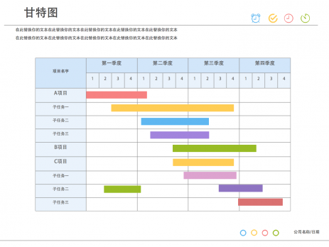 甘特图还有一个别称就是横道图。顾名思义,图形就是用横条表示的。甘特图的意义在于用横条来表示时间的进度,不论是在项目管理过程中,还是公司未来计划安排中都可以选择应用甘特图来清晰明了的表达。 ...