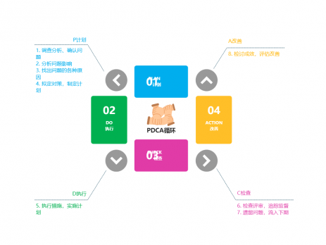 PDCA循环图是什么呢?PDCA循环图是指用于描述质量管理中Plan(计划)、Do(执行)、Check(检查)和Action(处理)四个阶段的一类图表。其中计划阶段包括搜集资料、找出问题、找出主要问题、制定计划措施四个步骤,处理阶段包括制定标准并形成规章制度,找出遗留问题并转入下一个循环两个步骤。 ...