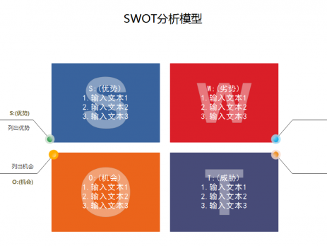 SWOT分析图的英文字母分别代表着Strength-优势、Weakness-劣势、Opportunity-机会和Threat-威胁。一般来说,SWOT分析图可成为一个平台进行组织战略分析,甚至一个项目的前期调研的实用工具。 ...